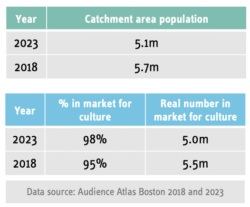 The Boston Metro area saw a sharp population decline during the pandemic, so although the market for culture is proportionally larger (98% in 2023, compared to 95% in 2018), in real figures there are 449k fewer people in the market in 2023.