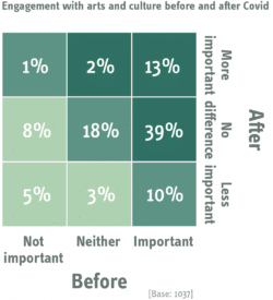 18% overall felt arts and culture were less important to them now than pre-pandemic. 10% of this group were those who previously felt arts and culture was important to them. While this is not a huge proportion of the market overall, it is important to acknowledge that the pandemic has made a real impact on how culture fits into priorities for some.