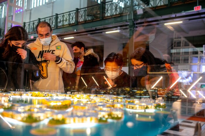 Visitors in awe of an Oceanix floating city model at FUTURES Remixed Family Day opening weekend by Mariah Miranda